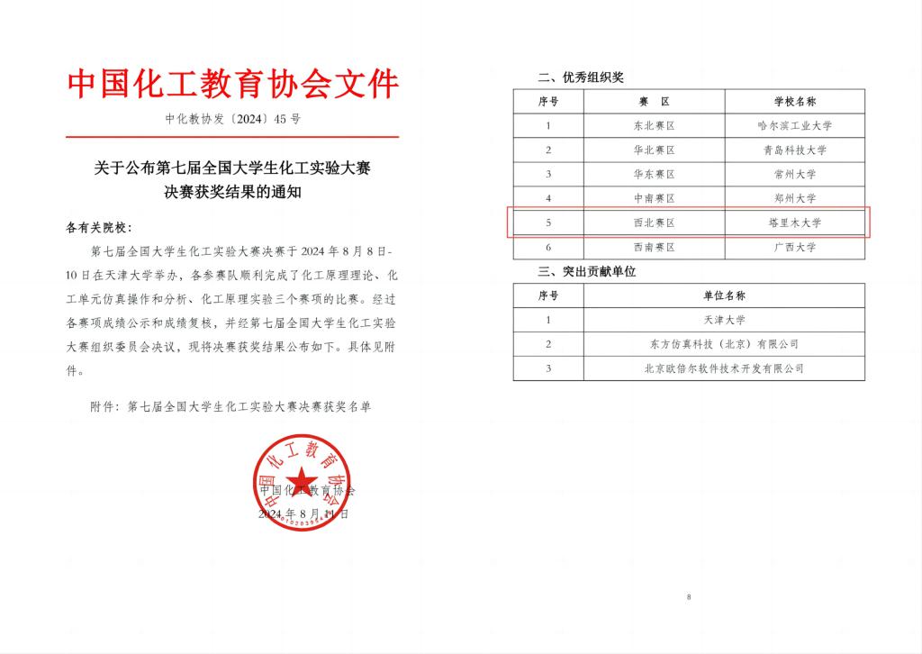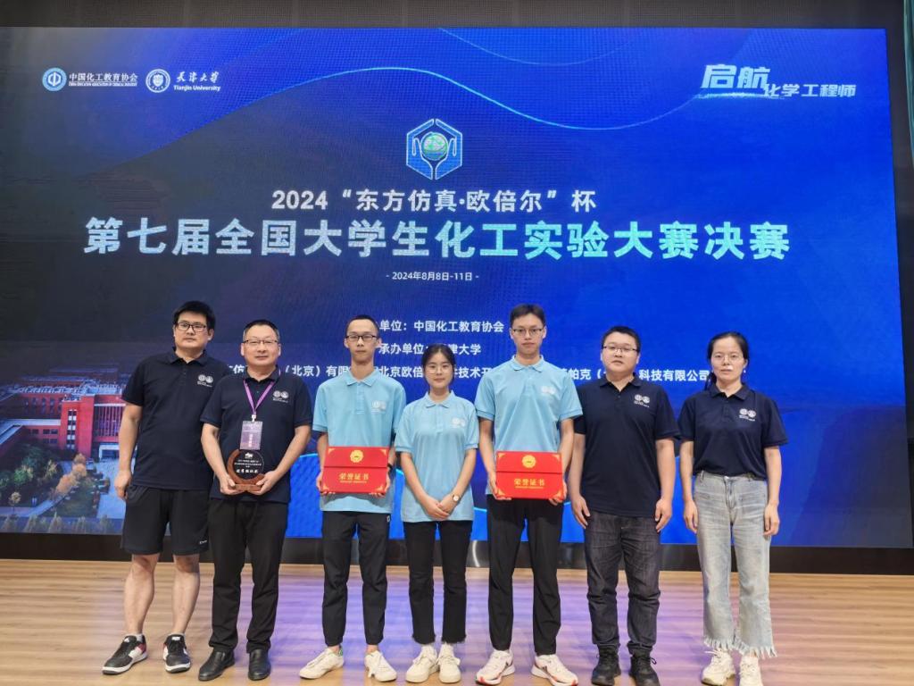 8月9日,第七届全国大学生化工实验大赛全国总决赛在天津大学举行。此次大赛共有3700余支队伍参赛,经过校赛和区赛选拔,最终来自全国6个赛区的84支代表队参加了全国总决赛,塔里木大学荣获优秀组织奖。塔里木大学化学工程与工艺专业2021级学生曾文涛、曾曦,化学工程与工业生物工程专业2021级学生彭静凡组成的“塔大”队,在侯进鹏、黄丽丽、田维亮三位老师的指导下,喜获全国总决赛二等奖。