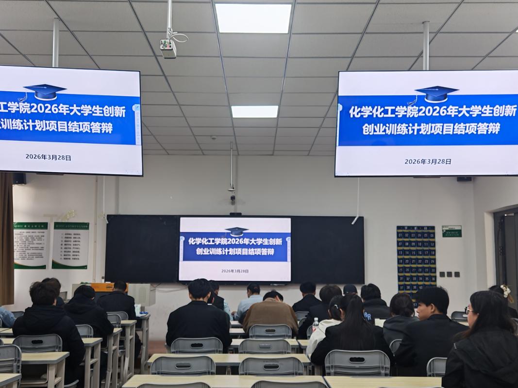 化学化工学院于2026年3月28日举行了“大学生创新创业训练计划项目”结题验收答辩会。评审专家及项目团队成员参加了本次验收会议。本次验收工作共有35个项目参与答辩,内容聚焦新能源材料研发、绿色化工工艺优化、智能检测技术创新、环境治理与修复、精细化工产品开发等多个化学化工领域前沿方向。