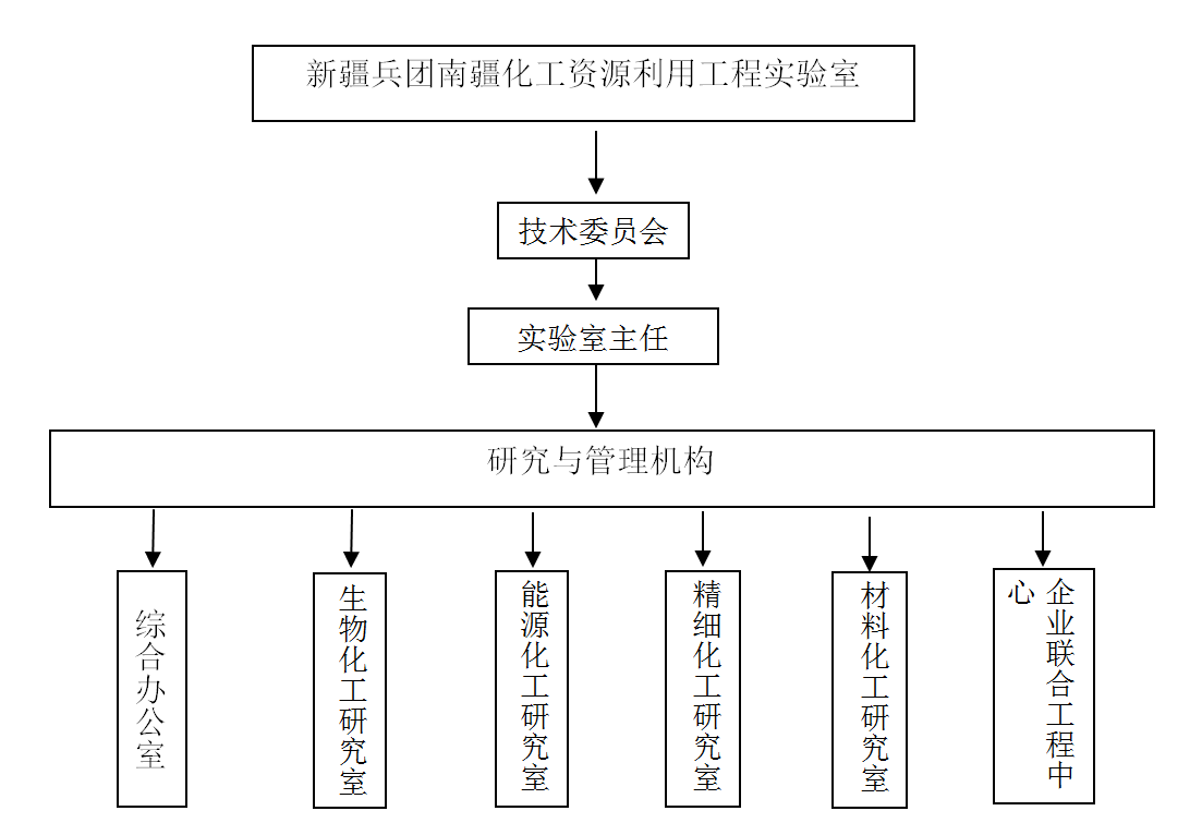 组建技术委员会,设主任委员1名,实验室主任1名,兵团南疆化工资源利用工程实验室下设4个研究室、1个企业联合工程中心和1个综合办公室(如图)。